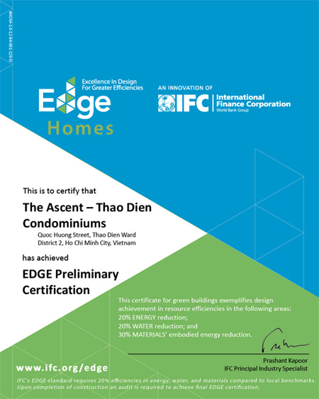 The Ascent – Thao Dien Condominiums được đảm bảo chất lượng bởi Tổng thầu thiết kế và thi công là Tập đoàn xây dựng Hòa Bình, một trong những tên tuổi xây dựng uy tín và kinh nghiệm hàng đầu Việt Nam. Với việc nhận được chứng chỉ EDGE do Tổ chức tài chính quốc tế (IFC) trao tặng cho công trình “sử dụng tài nguyên hiệu quả”, dự án The Ascent – Thao Dien Condominiums là sự lựa chọn hoàn hảo cho những ai đang muốn sở hữu một không gian sống xanh đẳng cấp và tinh tế. Các vật liệu thân thiện được sử dụng sẽ tiết kiệm đến 20,02% mức tiêu thụ năng lượng, 20,3% mức tiêu thụ nước và 30,04% vật liệu.