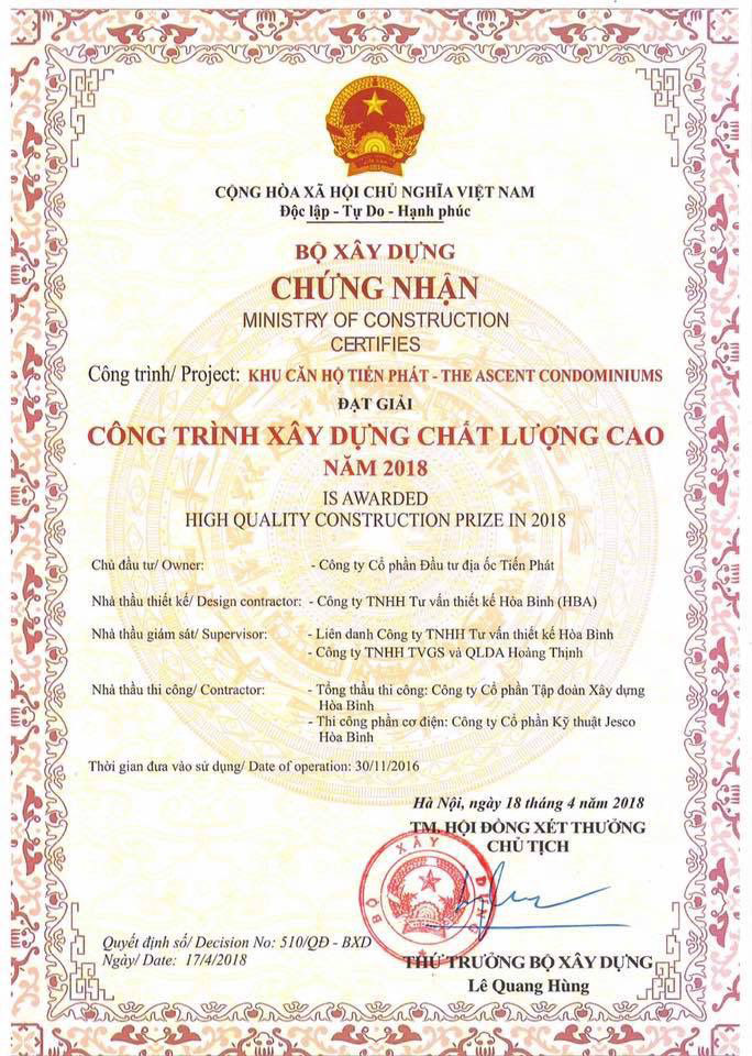 Với những thành tích đáng tự hào mà Công ty Cổ phần TVGS & QLDA Hoàng Thịnh đã đạt được trong suốt quá trình phấn đấu nỗ lực không ngừng nghỉ thời gian qua, Công ty Cổ phần TVGS & QLDA Hoàng Thịnh đã nhận được Bằng khen Bộ Xây dựng cho công trình : Khu căn hộ Tiến Phát - The Ascent Condomoniums là công trình chất lượng cao năm 2018.